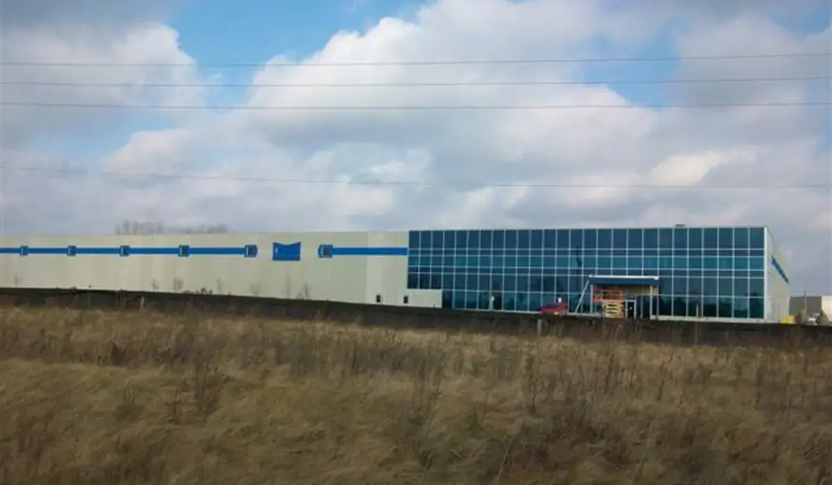 This 140,000-square-foot industrial manufacturing plant at 15790 Robin’s Hill Road features 28-foot clear heights in the warehouse. Originally scheduled for 290 days, Dancor completed the project in just 150 days, meeting a tight deadline. The two-storey office includes a striking curtain wall, while the precast incorporates the tenant’s corporate colors with a specialized flat blue band spanning the building, enhancing its recognizable presence in London since its completion in 2009. The facility supports London Machinery Inc.’s operations, which expanded from concrete mixing units to manufacturing garbage truck bodies, and includes fourteen drive-in doors of various sizes and two dock-level doors.